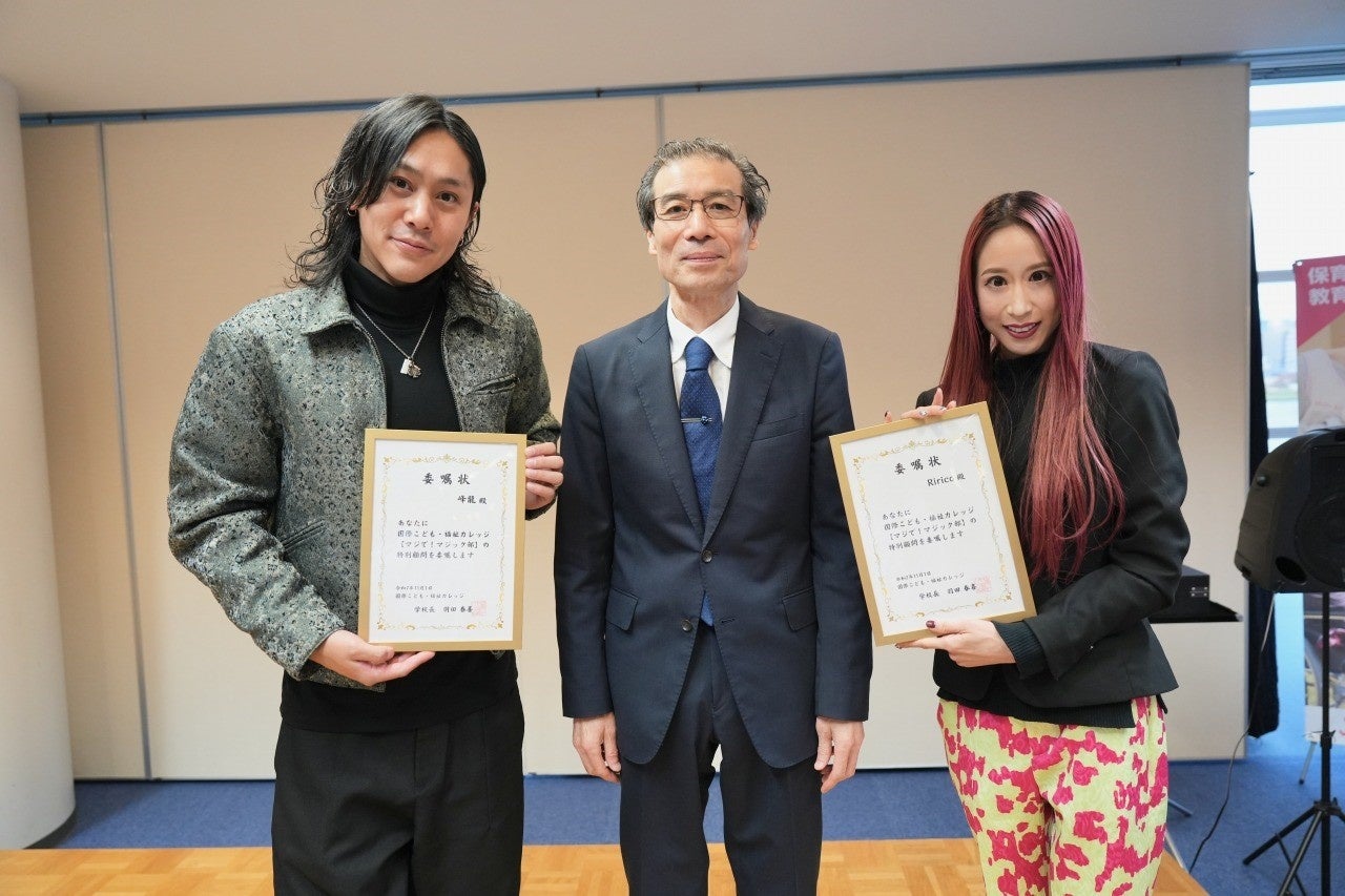 さらに、国際こども・福祉カレッジは昨年度、峰龍&Riricoさんのマジックショーを見た学生たちがマジックサークル(マジで!マジック部)を立ち上げて活動をしており、今回の特別講演会や学生たちの頑張りから、マジックサークルの特別顧問になっていただくことにもなりました。