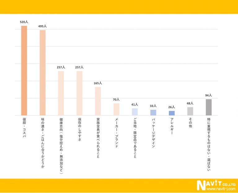 ご飯のお供を選ぶ基準についてのアンケートです。一番多かったのは「値段・コスパ」で520人、次に多かったのは「味の濃さ・ご飯に合うかどうか」で495人、3番目は「健康志向(塩分控えめ・無添加など)」と「保存のしやすさ」が同数で257人という結果になりました。