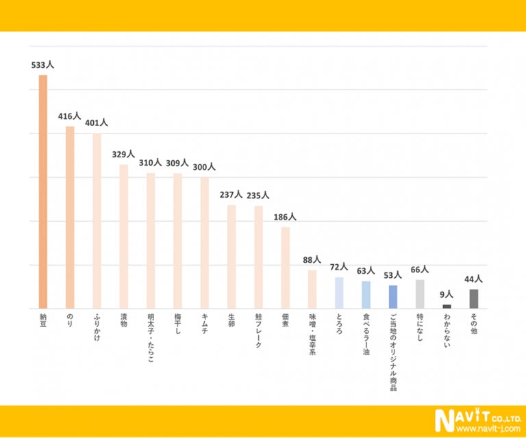 複数回答で回答をいただいきました。よく食べる「ご飯のお供」についてのアンケートです。一番多かったのは「納豆」で533人です。関西の人は納豆が苦手というのを聞いたことがあるので、正直意外でした。2番目に多かったのは「のり」で416人という結果になりました。次に多かったのは「ふりかけ」で401人という結果になりました。