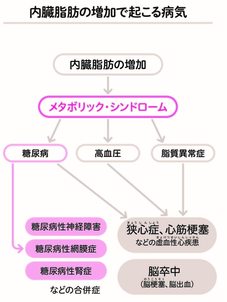 こうして内臓脂肪が増えると、やがて糖尿病、高血圧、脂質異常症といった生活習慣病を引き起こします。さらに、心筋梗塞や脳卒中など、死亡するリスクの高い病気を招きます。