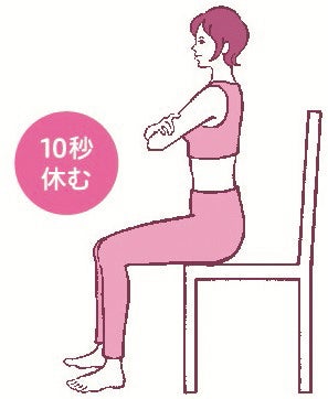 ③ 10秒キープしたら、いすに座る。10秒休んで足の緊張を解く。①~③を5回繰り返し、1セットとする。朝昼晩1セットずつ行う
