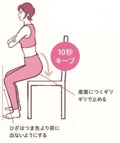 ② ①の姿勢から、お尻を突き出すようにしながら腰を落とす。できるだけゆっくりとひざを曲げ、太ももがいすにつかないギリギリのところで止め、10秒キープ