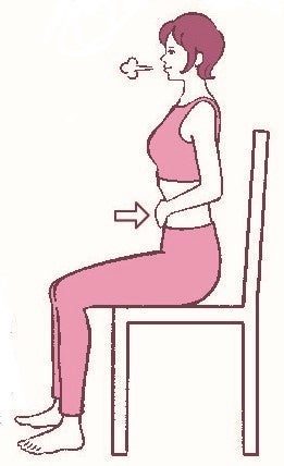 座ってやるときも、背すじを伸ばした姿勢で行う。おへその下に手を当ててドローインをすると、やりやすくなる