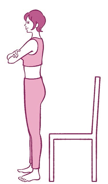 ① いすに浅く腰かけられるくらいの位置に立つ。足を肩幅くらいに開き、手は胸の前で組む