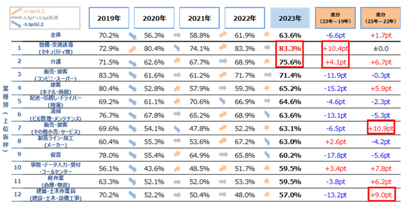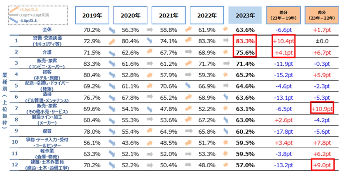 アルバイトの人材不足を感じた企業は63.6%(前年より1.7pt増)、業種別では[警備・交通誘導(セキュリティ等)][介護]で高く、コロナ禍前の不足感を上回る【図1】