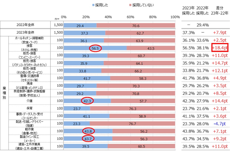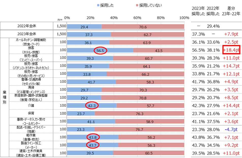 2023年にスポットワーカーを採用した割合は約4割で前年より7.9pt増加、業種別では[接客(ホテル・旅館)]が約5割でトップ【図4】