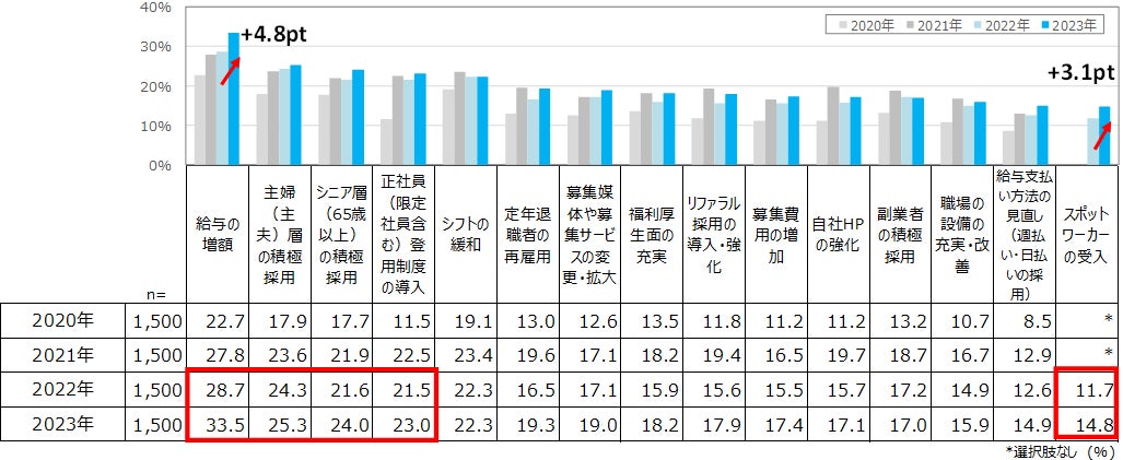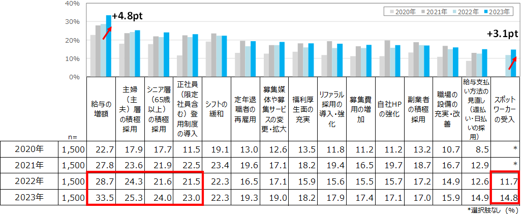 人材確保のために実施した施策は、「給与の増額(33.5%)」が2020年から連続で最も多く、次いで「主婦(主夫)層の積極採用(25.3%)」 、「シニア層(65歳以上)の積極採用(24.0%)」、「正社員(限定正社員含む)登用制度の導入(23.0%)」となった。前年と比べると、「給与の増額」で+4.8ptと最も増加し、次いで「スポットワーカー※の受入」で+3.1ptとなった。【図3】