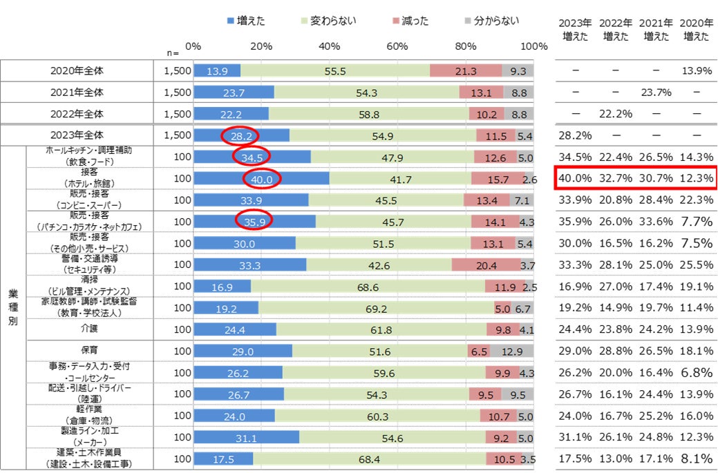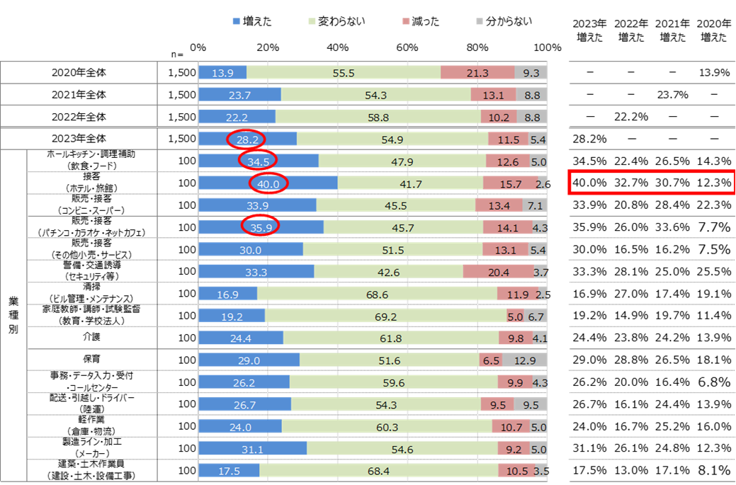 アルバイト採用数が前年より「増えた」企業は28.2%(前年比:+6.0pt)で、2020年の調査開始から過去最高となった。業種別では[接客(ホテル・旅館)]で40.0%(前年比:+7.3pt)と最も高く、次いで[販売・接客(パチンコ・カラオケ・ネットカフェ) ]で35.9%(前年比:+9.9pt)、[ホールキッチン・調理補助(飲食・フード)]で34.5%(前年比:+12.1pt)となった。宿泊業はコロナ禍で採用を縮小していたが、2023年5月に新型コロナウイルスの感染症の位置づけが5類に移行されたことを受けて、観光やインバウンド需要が回復する中で採用数が増加したと考えられる。【図2】