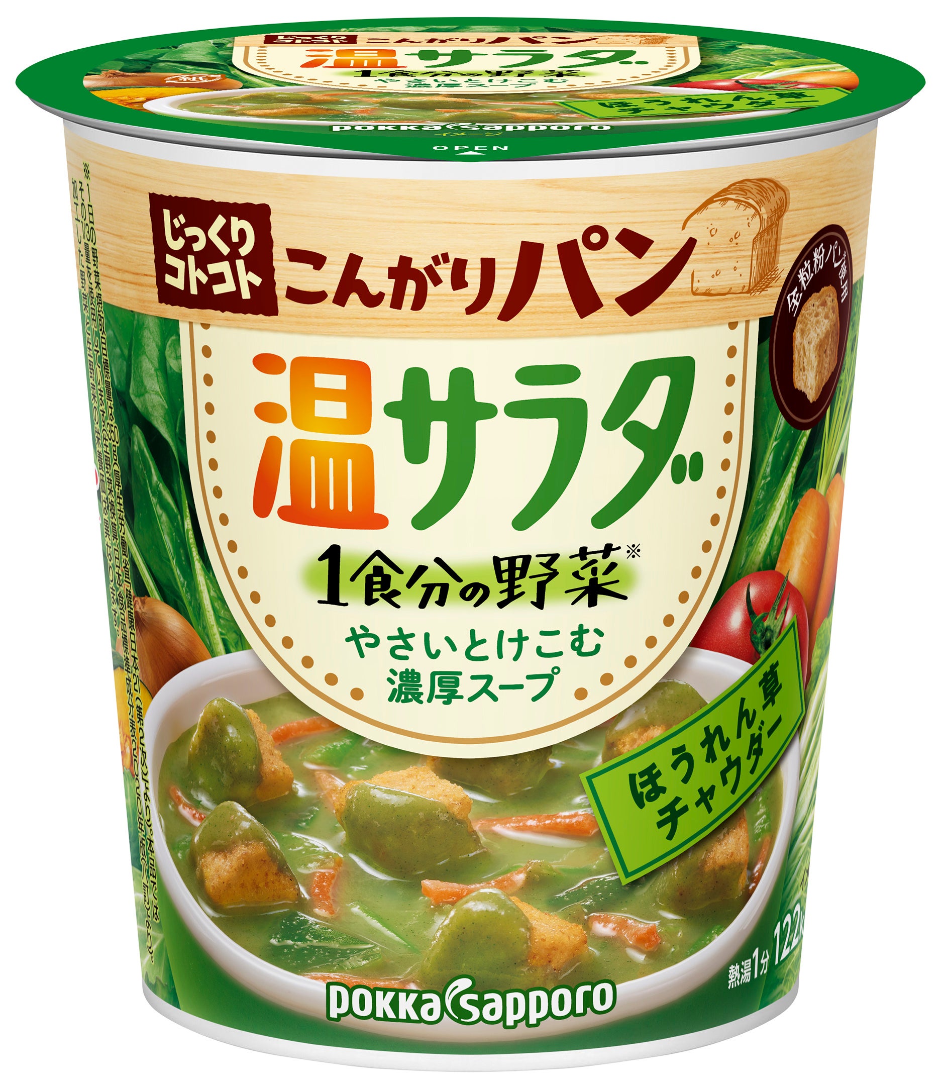 2018年以降、野菜訴求のカップ入りスープ市場は、151%と大幅に拡大し※2、「じっくりコトコトこんがりパン1食分の野菜」シリーズも、市場の広がりともに、大きく伸長してきました。今回、スープをサラダ感覚でお召しあがりいただけるよう「じっくりコトコトこんがりパン温サラダ」と名前を変更し、中身設計も見直しました。「温かいサラダ」をコンセプトに、刷新前と比べ、使用している野菜の種類を増やし、野菜の濃厚さと美味しさ・野菜の食感と素材がより感じられる味わいへと魅力を高めました。“ほうれん草チャウダー”“ミネストローネ” “オニオンチャウダー”の3種類のラインナップで、すべて「1食分の野菜※3」入りです。野菜が溶け込んだスープで、体を温めながらサラダ感覚で手軽に野菜が摂れる商品として価値をお伝えすることで、「じっくりコトコト」ブランドの活性化を図っていきます。