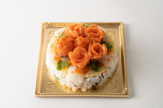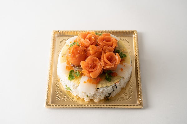 「母の日ありがとう寿司ケーキ」は、ゆず酢飯のちらし寿司の上に、スモークサーモンで表現したバラで華やかに彩られています。