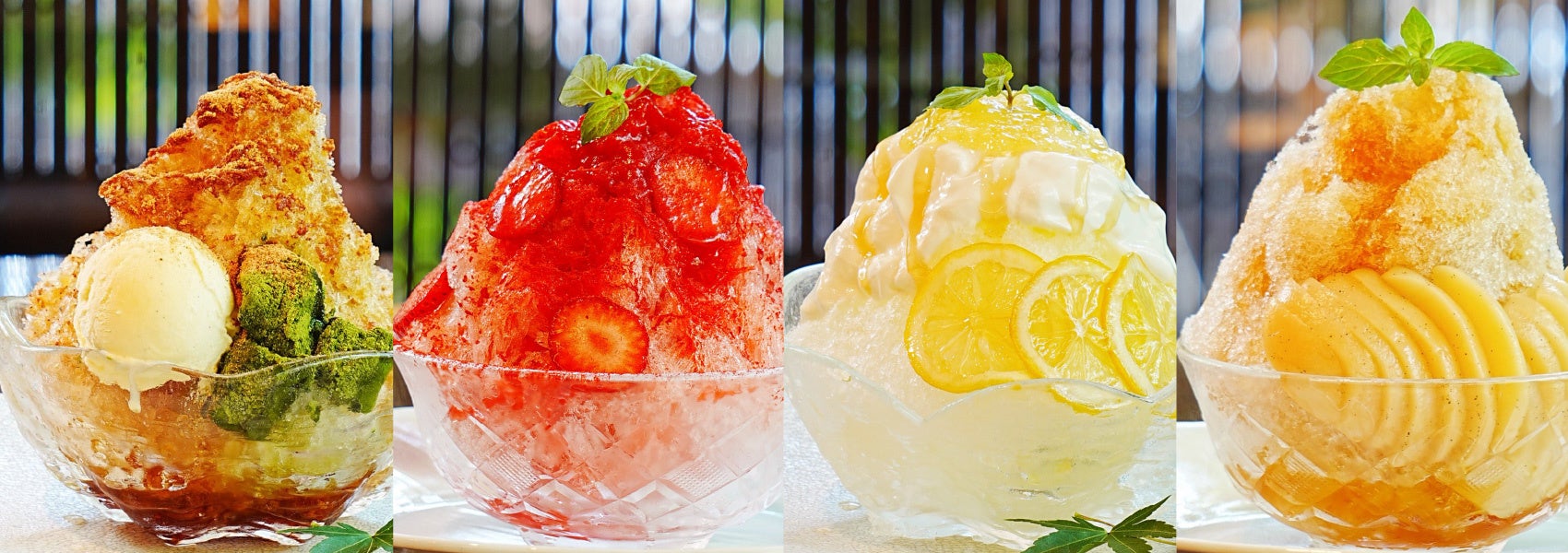 今年のメニューは地元食材にひと手間かけて仕上げた2種と、フルーツの果肉感を楽しむホテルパティシエ考案の2種をそれぞれ月替わりでご提供いたします。一つひとつ手削りで仕上げたふわふわの氷と、夏季限定の趣向を凝らしたこだわりの味わいでひとときの涼をお楽しみください。