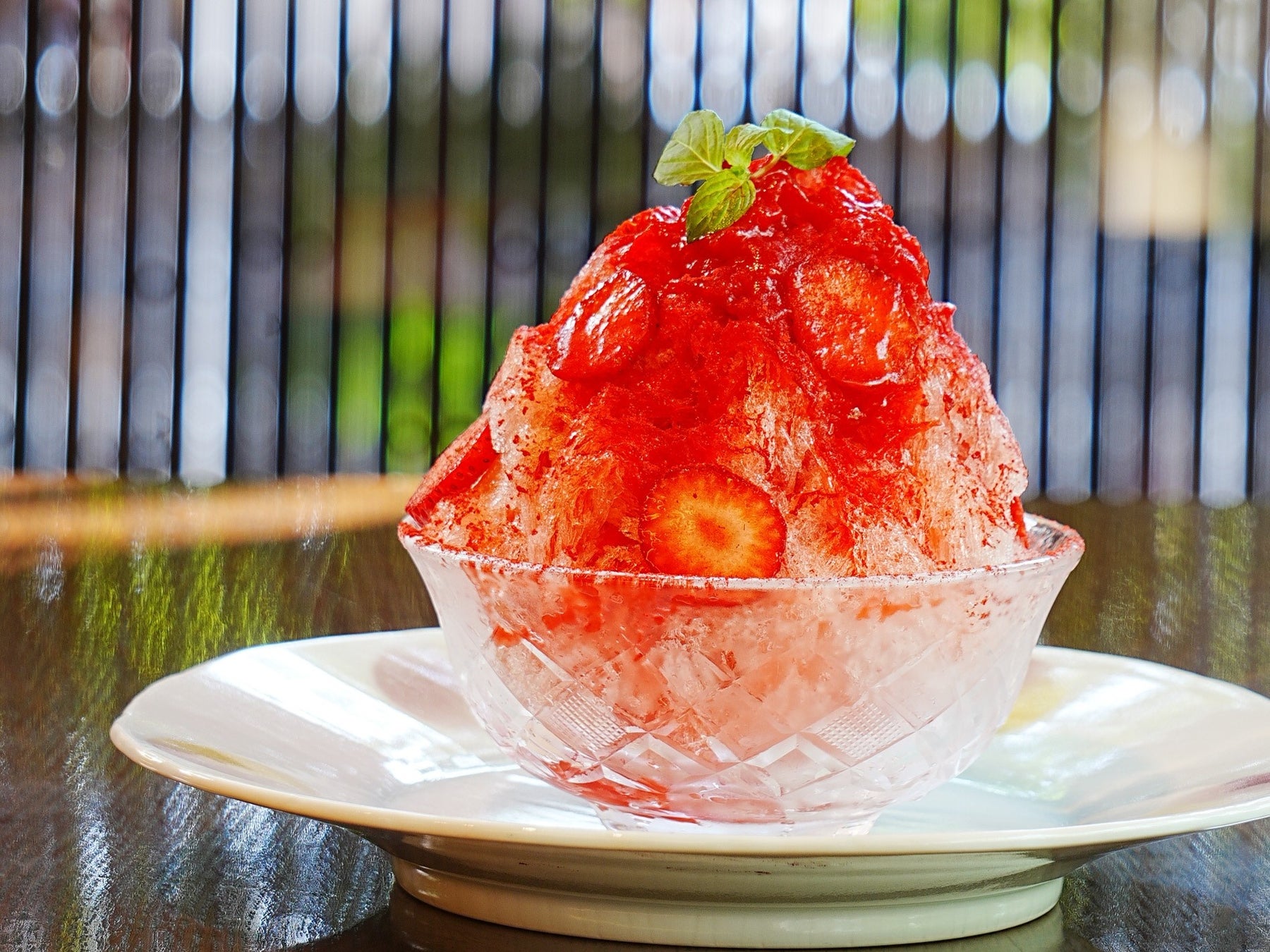 甘酸っぱい苺の果肉入りシロップにハイビスカスのほのかな香りを加えた 特製シロップをたっぷりとかけ、ドット模様に見立てた冷凍いちごを盛り付けた可愛らしい一品。