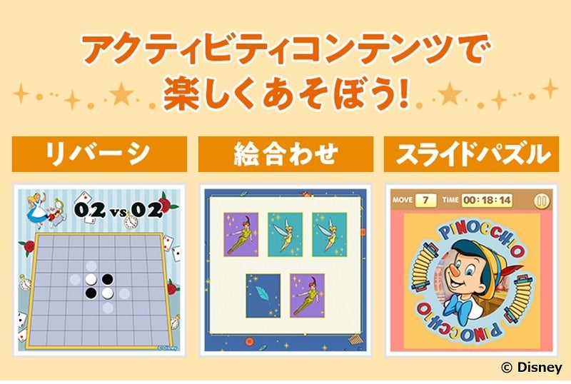 リバーシや絵合わせ、スライドパズルなど楽しく遊べるアクティビティコンテンツも配信!各ステージには「不思議の国のアリス」や「塔の上のラプンツェル」、「アナと雪の女王」などDisneyの人気作品が登場。