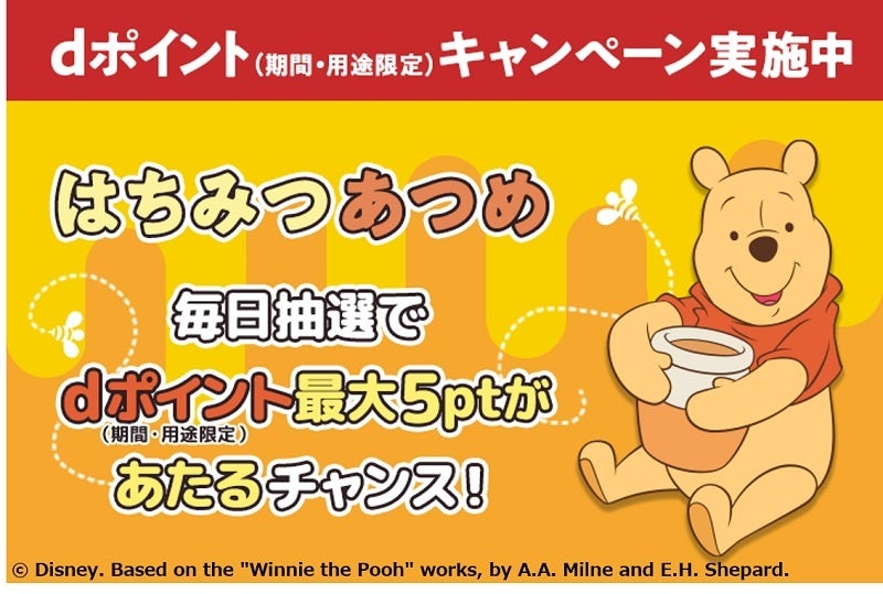 スゴ得コンテンツ内で「Disney forスゴ得」をマイページ追加すると、初回限定でdポイント(期間・用途限定)を1pt全員にプレゼントします。さらに「はちみつあつめ」のコーナーでは、dポイント(期間・用途限定)が抽選で1日最大5ポイントあたるキャンペーンも実施!奮ってご参加ください。