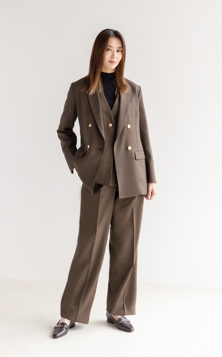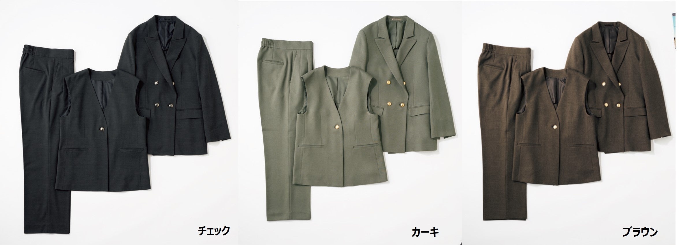 ジャケット、ジレ、パンツの3アイテムをブラウン、カーキ、チェックの3色展開で。40代が気になる体形カバーデザインや、ホームケアできる素材、防シワ加工など、こだわり満載の着まわし力最強セットアップ。