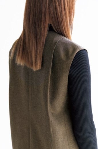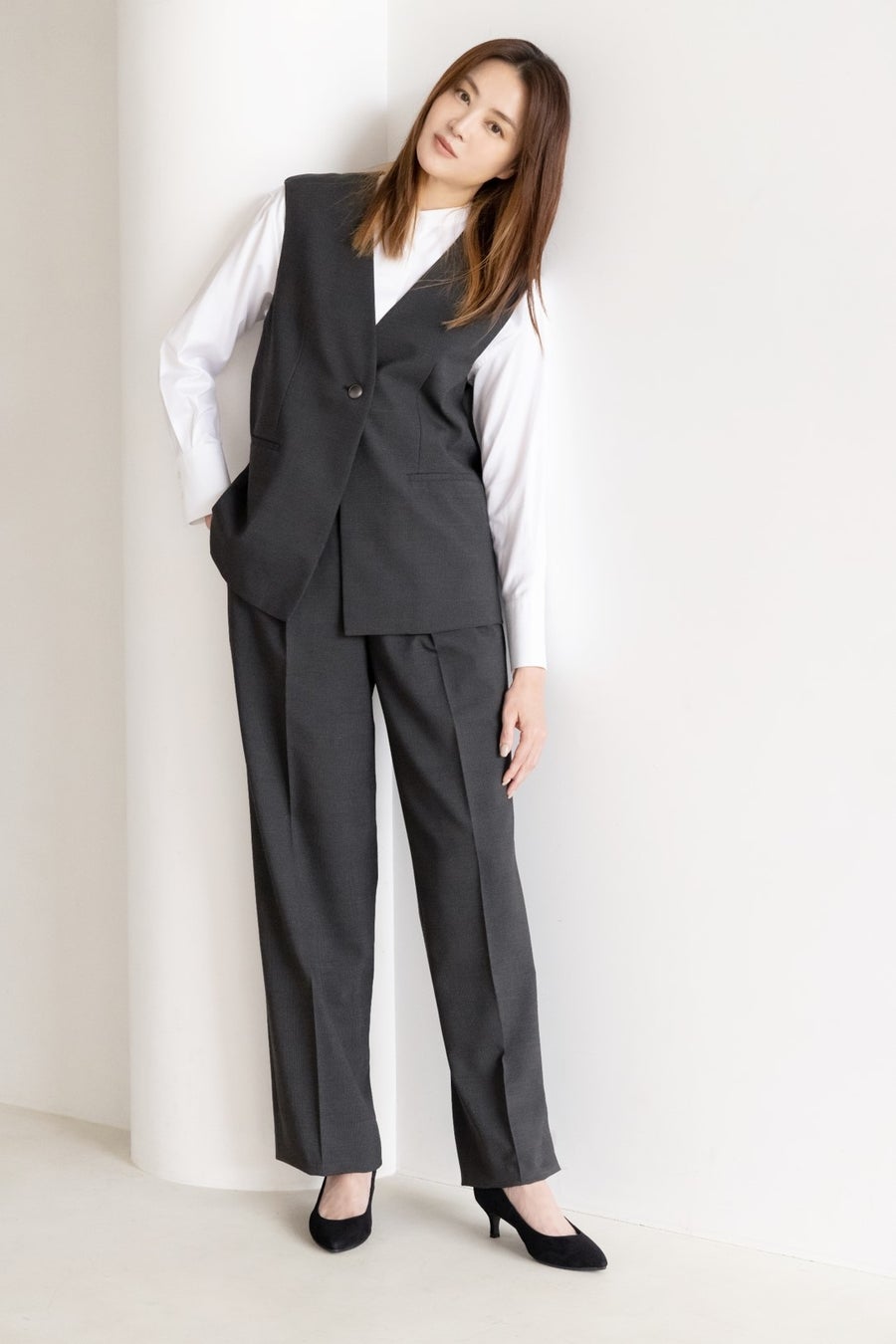 ジレ…上半身~腰まわりをタイトに引き締め、セットアップはもちろん着まわしも楽しめる。