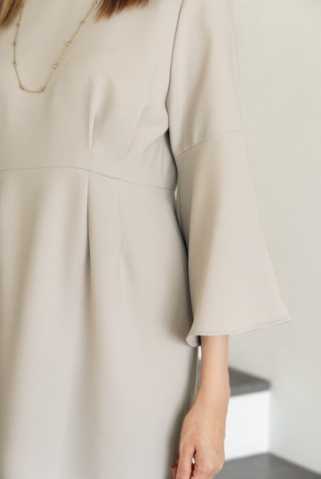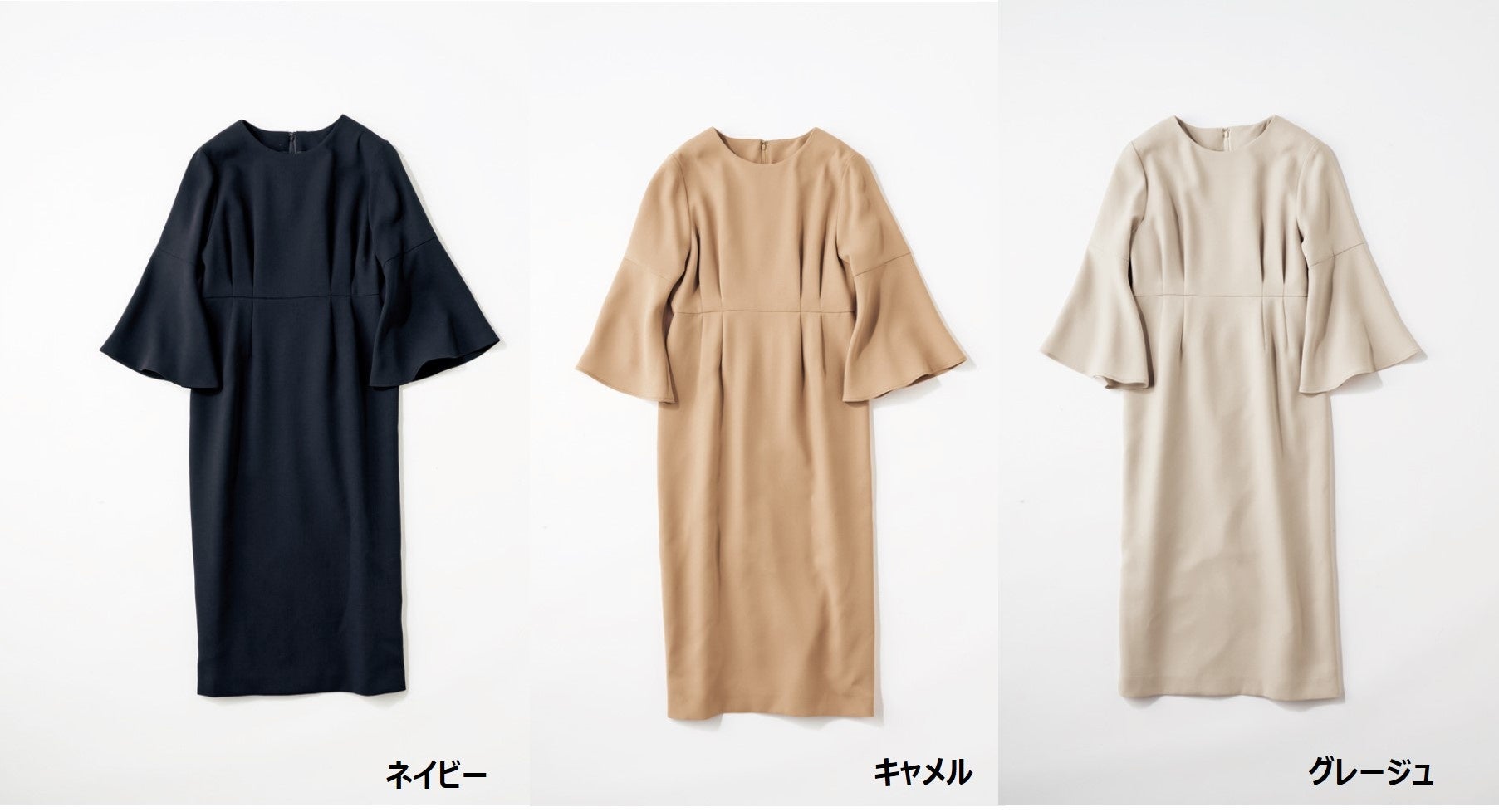 ▼ワンピースの華やかな印象のベルスリーブは、八分袖にすることで腕まわりを華奢に見せ、動きやすく。