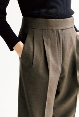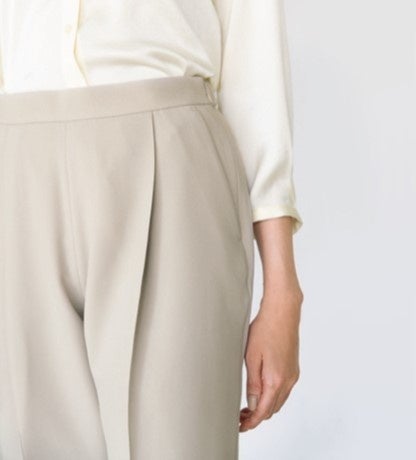 パンツ…センターのピンタックとゆるやかにテーパードがかかった九分丈のパンツは、脚長、細見え効果を発揮してくれる。