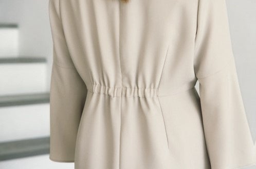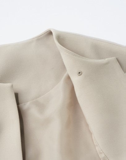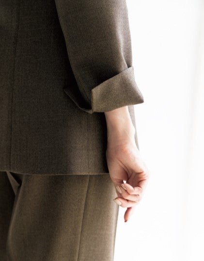 ノーカラージャケット…袖とバックスタイルのフレア感が着こなしを華やかに。ノーカラー&ドロップショルダーでワンピースにもサラッと羽織れる設計。