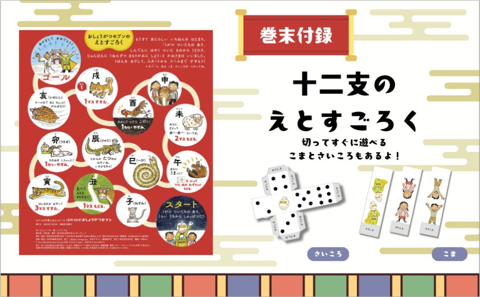 巻末付録は、十二支を分かりやすく面白く学べる「えとすごろく」です。切って使えるさいころとこまも付いていますので、すぐに遊ぶことができます。