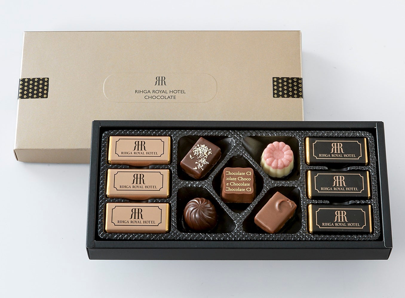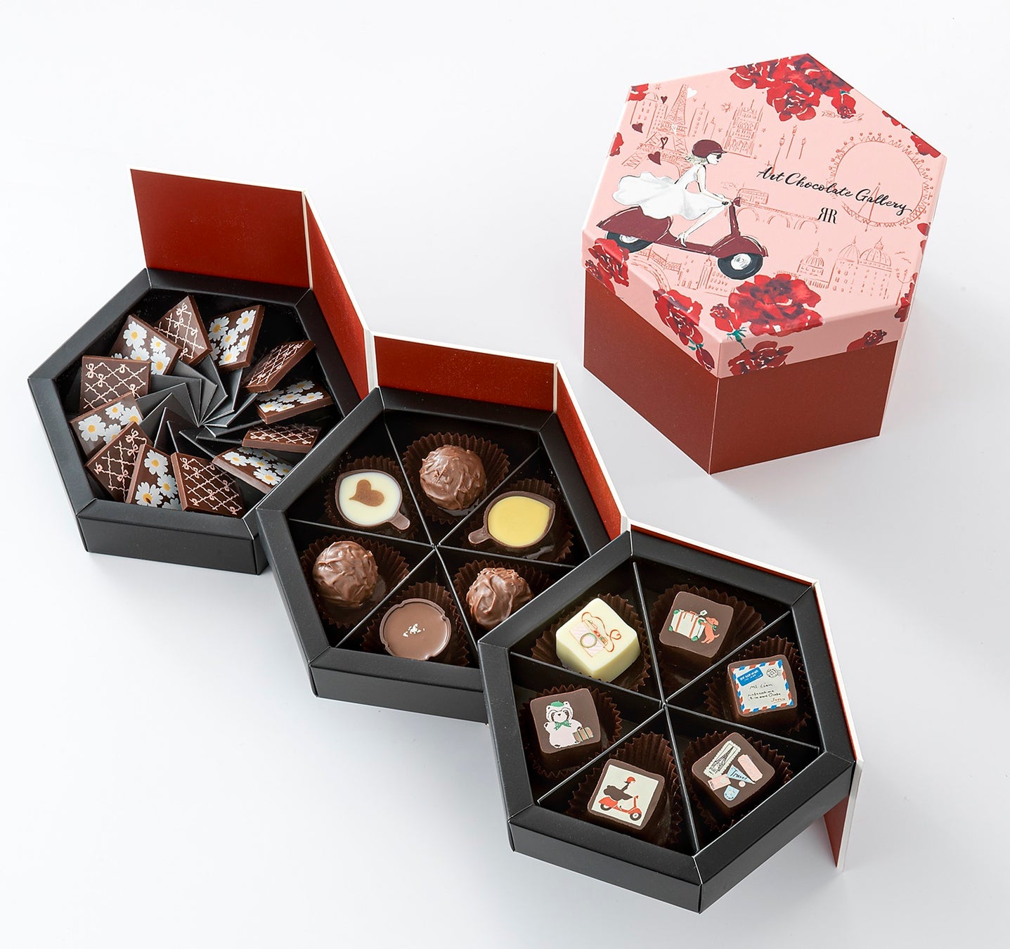 スタイリッシュな3段BOXに、ピスタチオ風味や、ヘーゼルナッツ和三盆風味、いちご練乳風味などシェフおすすめショコラ12種のアソート。