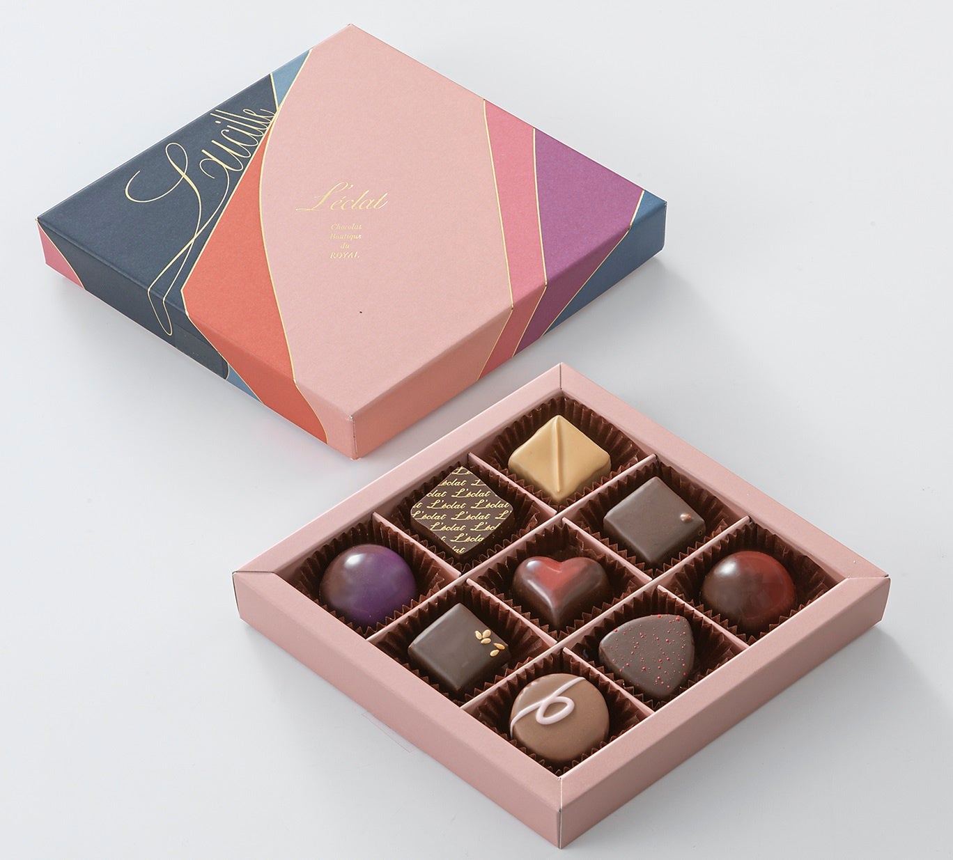 ヴィンコット(ぶどう風味)やジャンドゥーヤ、いちご練乳風味など、ボンボンショコラ9種のアソート。 ※お酒の使用あり