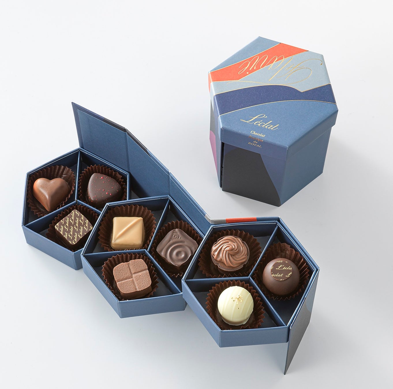 発売当初から大人気のレクラを代表する8惑星・太陽と、ヘーゼルナッツやピスタチオなどシェフ監修のこだわりのチョコレート18種を2段に詰め合わせた豪華なアソート。※お酒の使用あり