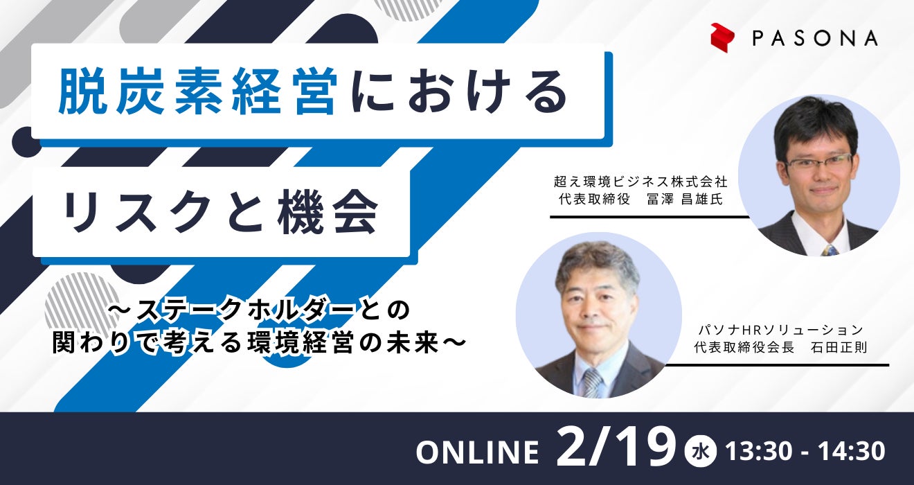 株式会社パソナは、GX経営を進める企業の経営企画やサステナビリティ部門、またカーボンニュートラル部門の担当者などを対象に、ウェビナー『脱炭素経営におけるリスクと機会』を2月19日(水)に開催いたします。