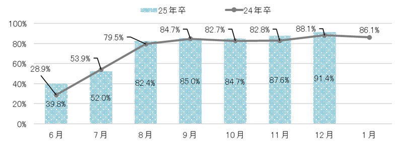 25年卒学生の12月時点でのインターンシップ・仕事体験の参加割合は前年から3.3pt増の91.4%となった。インターンシップの定義改正が行われるなど、学生の関心も高まり参加率が上がっているようだ。【図1】