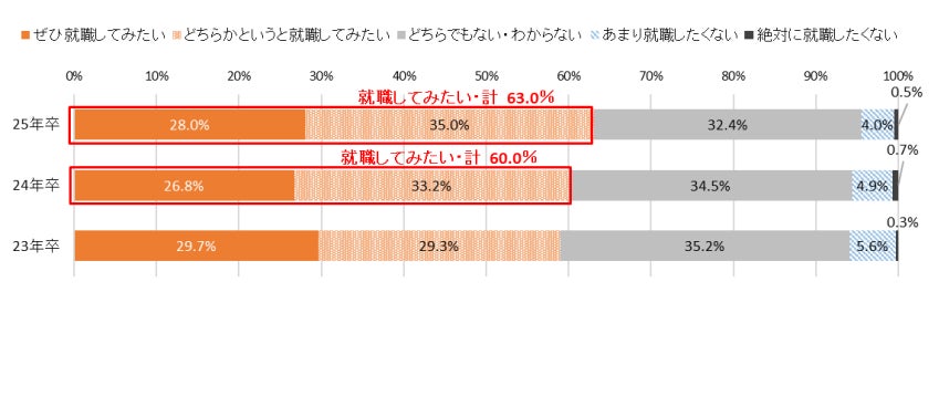 週休3日制についての認知度は、「人に説明できる程度に知っている(8.6%)」と「おおよその意味は分かっているが説明する自信はない(37.5%)」を合わせると、46.1%となり、直近3カ年と比較しても徐々に認知度が上がっていた。また、週休3日制の企業への就職については、「就職してみたい(ぜひ+どちらかというとの合計)」が63.0%(前年比3.0pt増)だった。厚生労働省の調査によると、週休3日制など「完全週休2日制より休日日数が実質的に多い制度」を取っている企業は全体の7.5%とまだ少数である※2。今後、どの程度普及していくのかは未知数であるが、ワーク・ライフ・バランス志向が高まっている社会において、こうした制度を導入している企業は大きなPRポイントとなるだろう。【図5、6】