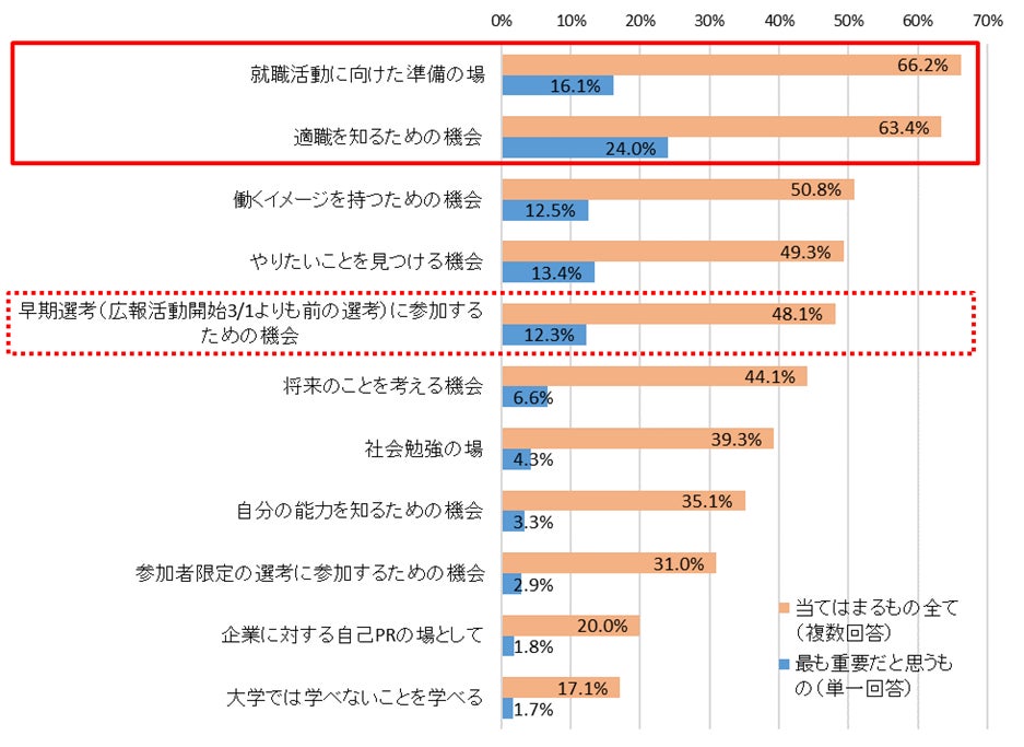 インターンシップの位置づけを聞いたところ、複数回答で当てはまるものすべてを選択してもらった場合は「就職活動に向けた準備の場」が最多で66.2%、最も重要だと思うものを単一回答で選択してもらった場合は、「適職を知るための機会」が最多で24.0%となった。25年卒においてはインターンシップの定義が改正され、「広報活動開始後」という条件があるものの、インターンシップ参加時の情報を採用選考に利用できるようになった。インターンシップ期間から就職活動を意識する傾向も高まっており、「早期選考に参加するための機会」※1という回答も複数回答で48.1%と半数近くになった。しかし、それを最大の目的とするのではなく、キャリア形成を目的としてインターンシップに参加している学生も多いようだ。【図2】