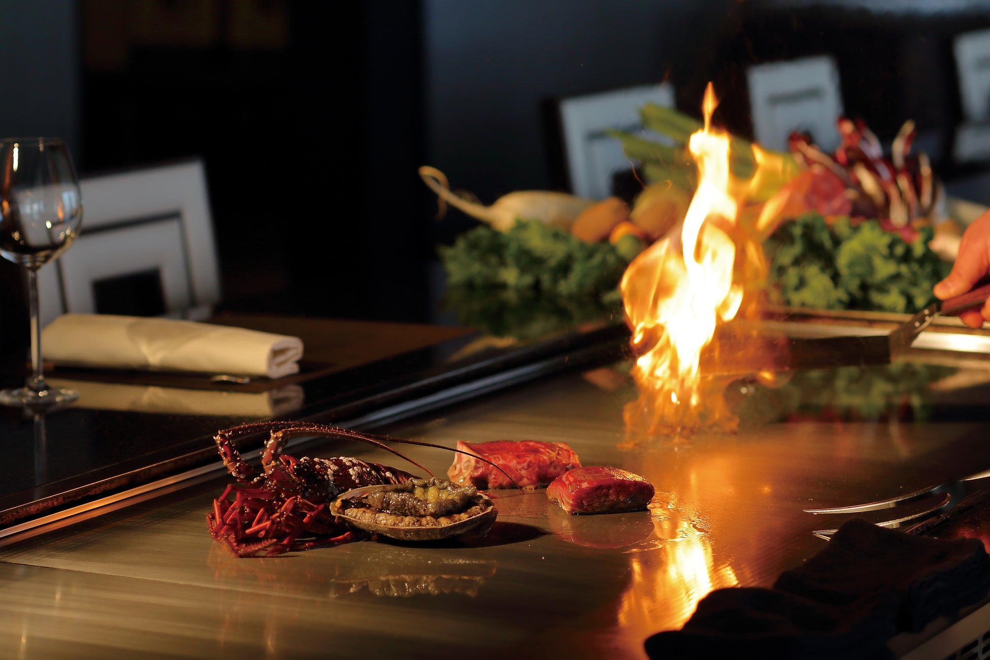 熟練シェフが目の前で食材にひと手間を加えるライブパフォーマンスは、五感で味わう舞台のよう。鉄板の焼き音、香ばしい香り、炎が織りなす臨場感で、食事の時間を特別なエンターテインメントへと昇華させます。