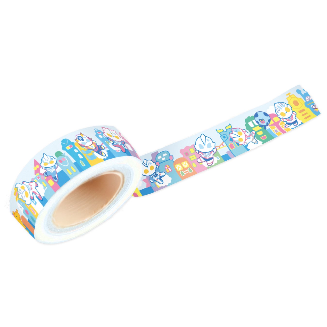 M78ウルトラマンたちがずらりと並び、どこを切り取ってもかわいいマスキングテープです。FLOWERは白地を基調にウルトラヒーローやダークヒーロー、ポップなお花をあしらい、シンプルでなじみやすいデザインに仕上げました。TOWNは街中のウルトラヒーローたちのようすを表現した全面デザインで、シンプルな手帳やステーショナリーなどに貼るだけで小物が華やかになります。