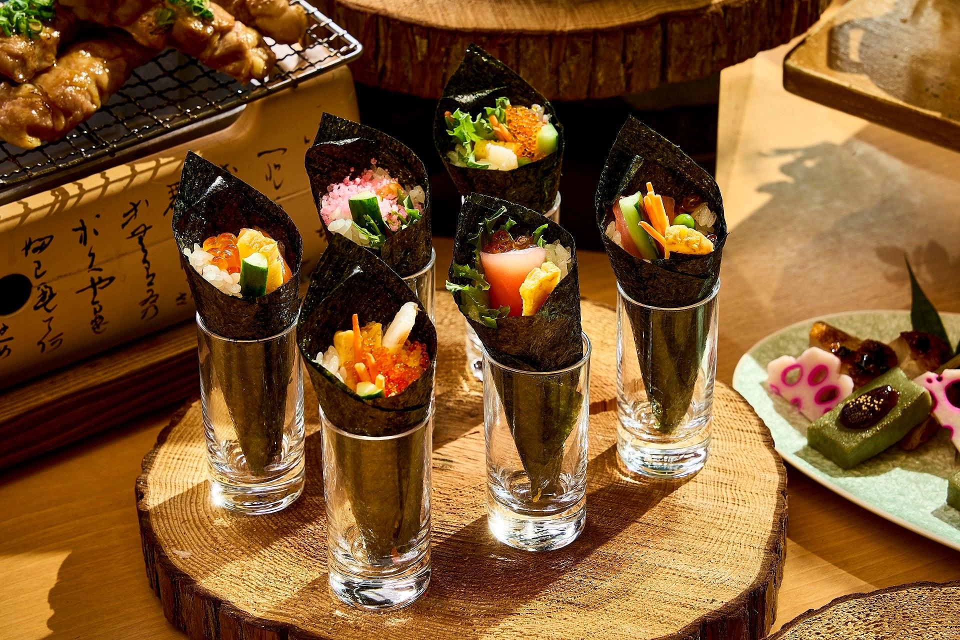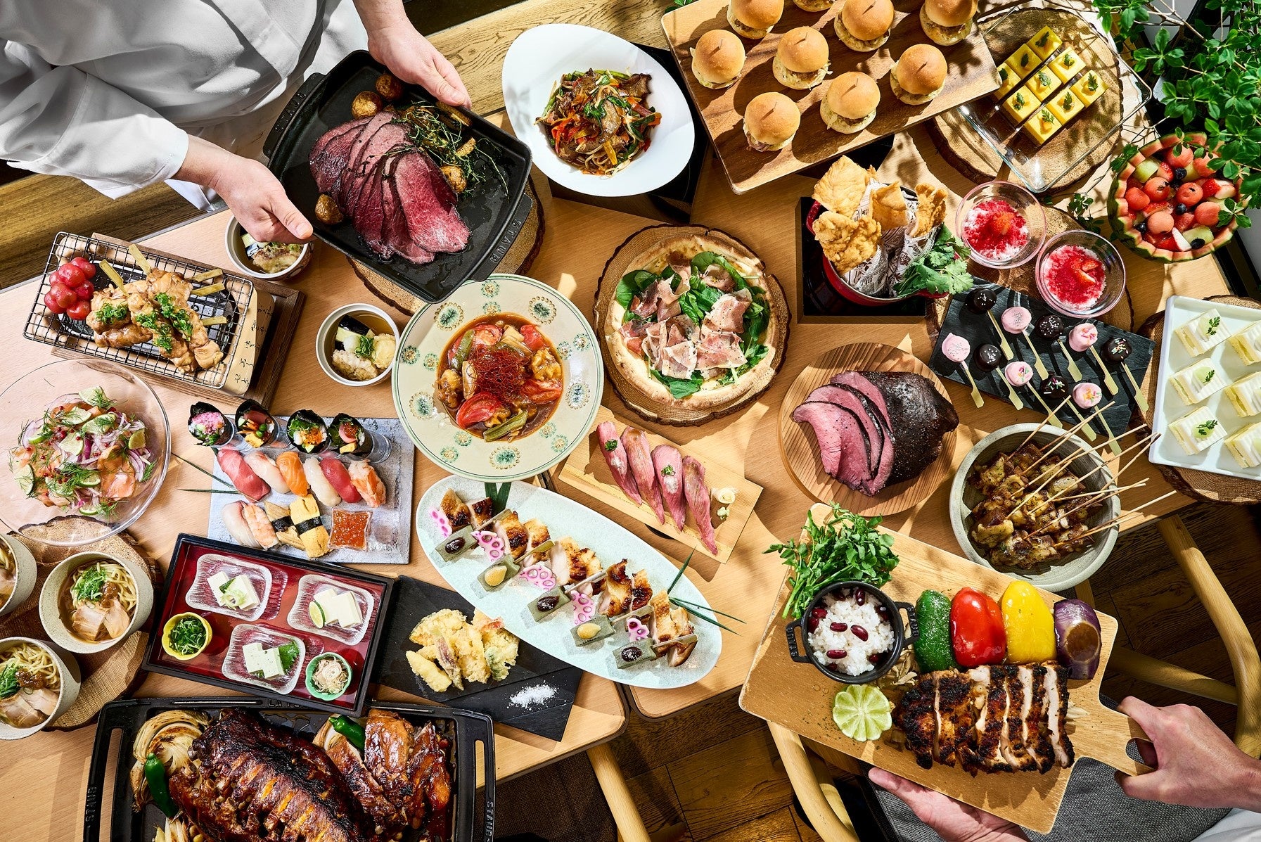 セビーチェ/ラーブガイ/コールドミート盛り合わせ/二色魚そうめん /豚肉と豆苗の卸しポン酢/日替わり冷やし京やっこ/だし茶漬け/ジャークチキン ライス&ピーズ/海老のスイートチリマヨソース/豚肩肉とジャガイモのロースト/プルコギ/国産牛と京焼き豆腐のすき焼き風煮込み /かわはぎの唐揚げ甘酢あん/やきとり 六味添え/ローストビーフ/プルドポークバーガー/ホテルオリジナル引き立てコンソメスープ/生ハムとルッコラのピッツァ/牛串炙りチーズ 味噌デミソース/ポークバックリブ/握り寿司/肉寿司(ローストビーフ握り寿司)/手巻き寿司/天ぷら/鮑のワイン蒸しフレッシュトマトソース(土日祝限定)