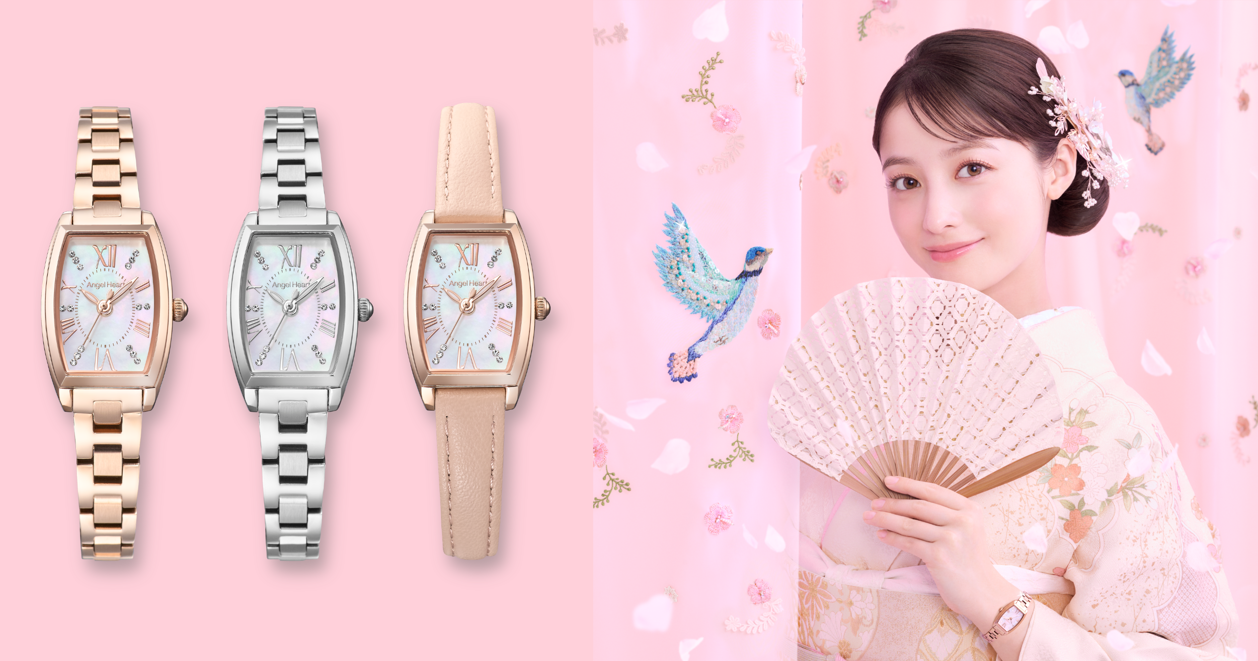 橋本環奈さんがミューズを務める時計ブランドAngel Heartは、小ぶりなトノー型のMADE IN JAPANモデル『SAKURA TIME』3型を全国の時計店と公式オンラインショップで発売します。