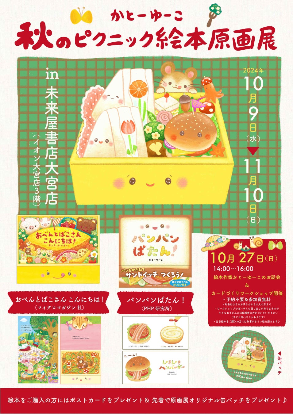 未来屋書店 大宮店にて「かとーゆーこ 秋のピクニック絵本原画展」開催!『おべんとばこさん こんにちは!』などを手掛ける人気絵本作家の原画を展示。作家による、お話し会&ワークショップも開催決定。