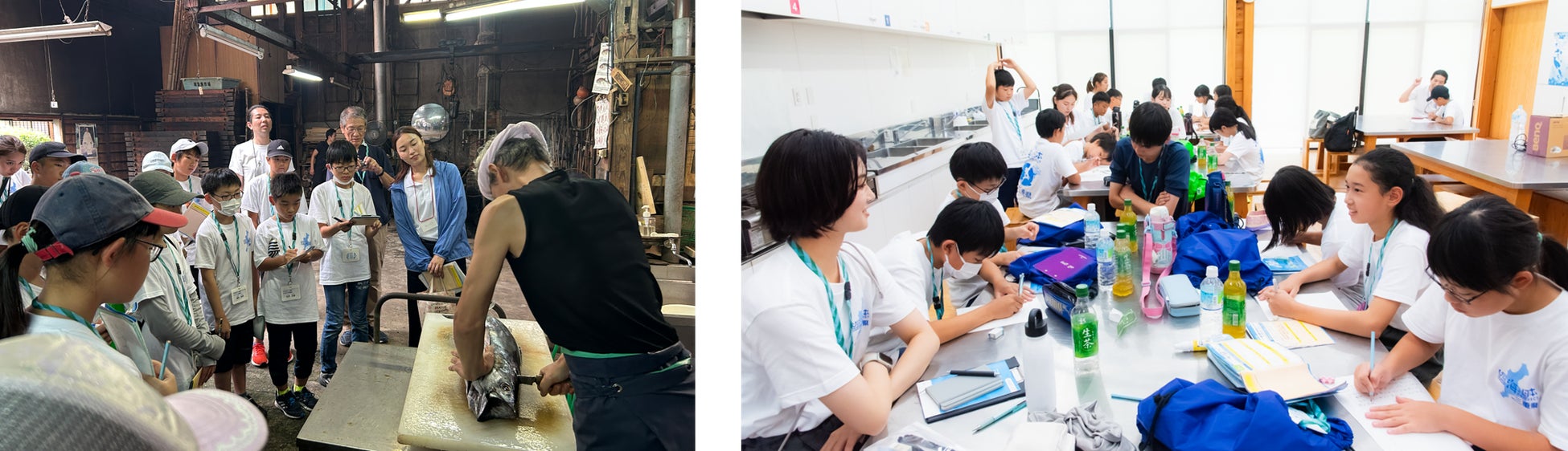 その後、近年の尾鷲の海における魚の種類や漁獲量の変化についても学び、この土地の循環にも大きな変化が生じていることを知った子どもたちは、地域の人たちがその海の恵みをどのように活用してきたのかを学ぶため、魚介類の加工品の製造・販売を行う明治35年創業の「大瀬勇商店」へと向かいます。