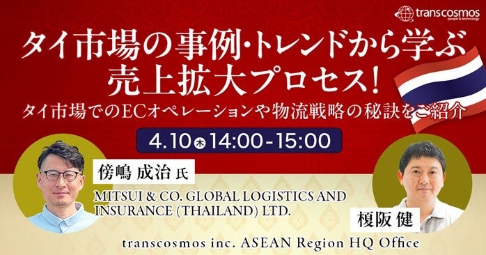 トランスコスモスは、オンラインセミナータイ市場の事例・トレンドから学ぶ売上拡大プロセス!~タイ市場でのECオペレーションや物流戦略の秘訣をご紹介~を4月10日(木)に開催します。