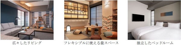 全室リビング、キッチン&ダイニングと畳スペースに加え、2~3ベッドルームで構成された、スイートタイプの客室。多人数で同室に泊まる楽しさと、それぞれがくつろぐ時間を大切にできます。