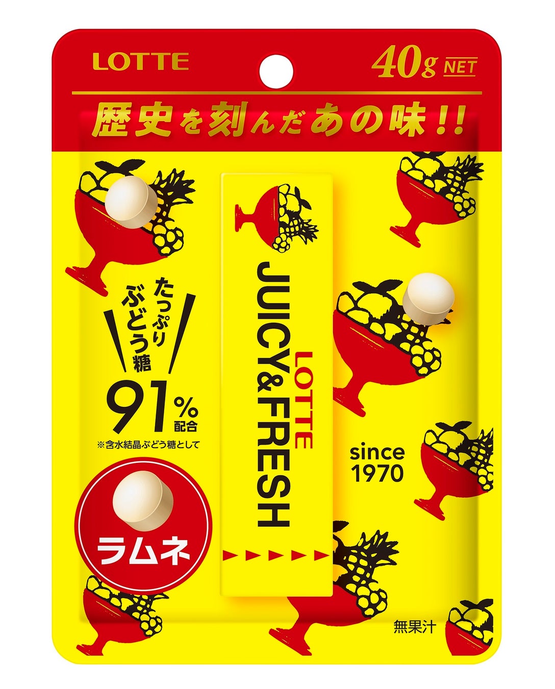 1970年から1995年頃まで発売していた「ジューシー&フレッシュガム」の味わいをラムネで再現しました。