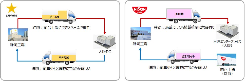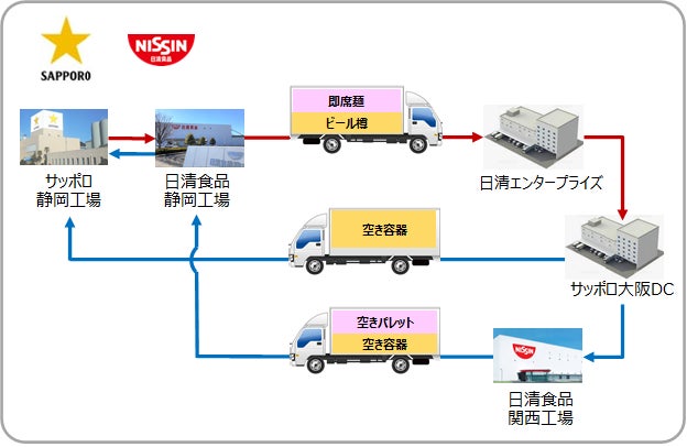 サッポロは静岡工場 (静岡県焼津市) から大阪物流センター(大阪府大阪市、以下大阪DC) まで、日清食品は静岡工場 (静岡県焼津市) から日清エンタープライズ (大阪府摂津市) まで製品をそれぞれ輸送していました。今後は、サッポロ静岡工場でビール樽を積載したトラックが日清食品静岡工場に立ち寄り、即席麺製品を積載後に大阪へ輸送し、それぞれの倉庫で荷降ろしします。
