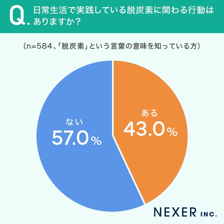 43%の方が、日常生活で実践している脱炭素に関わる行動が「ある」と回答しています。