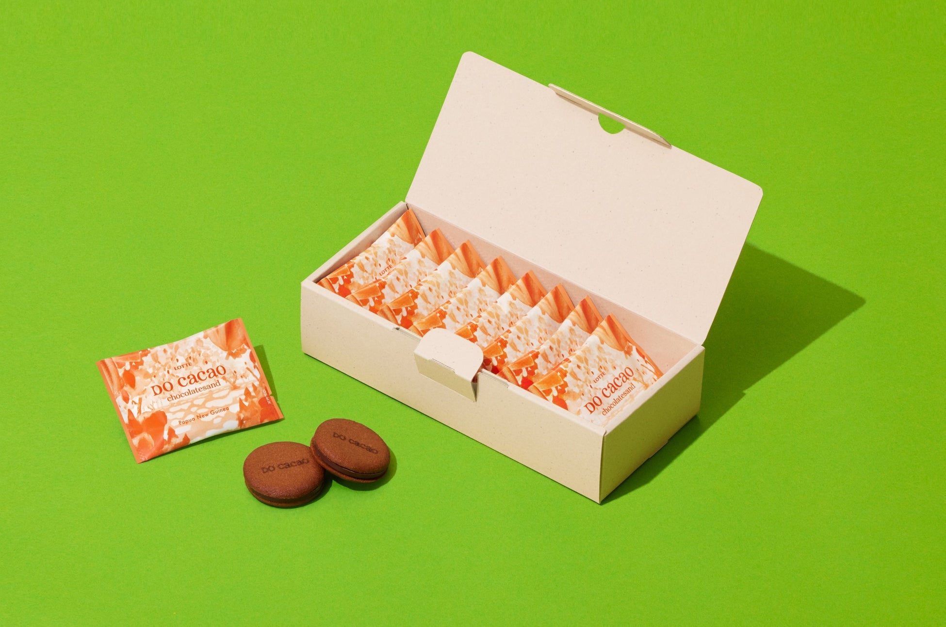 パプアニューギニア産カカオで作ったチョコレートを、香ばしく焼き上げたほろ苦いクッキーでサンドしました。