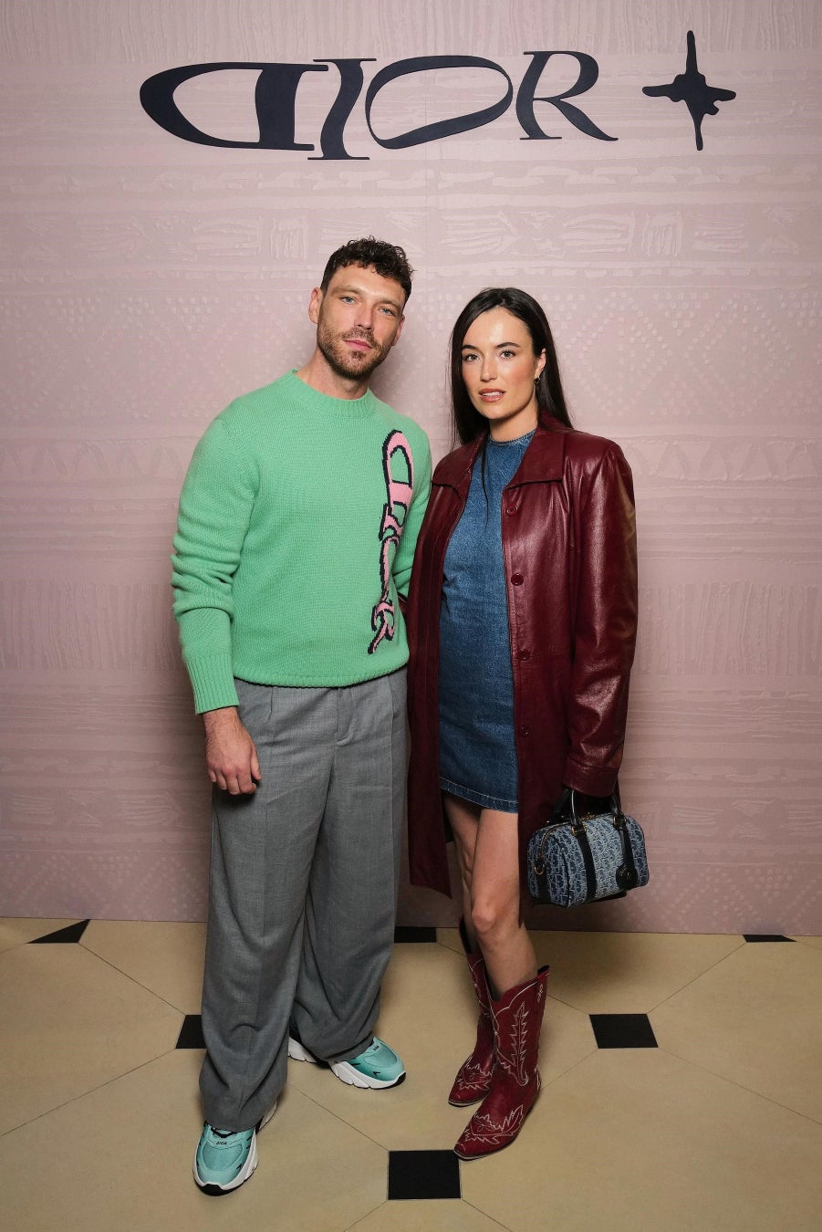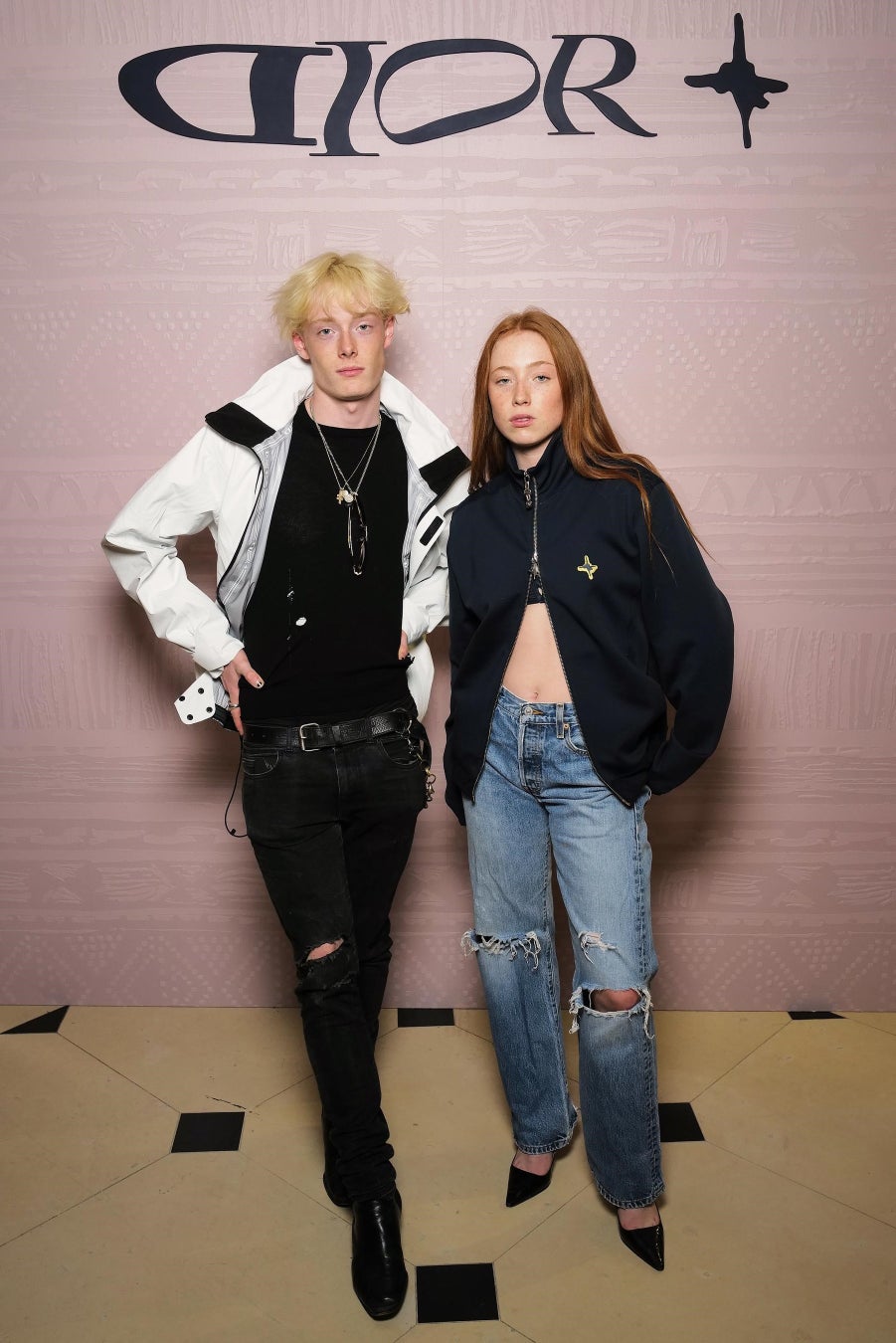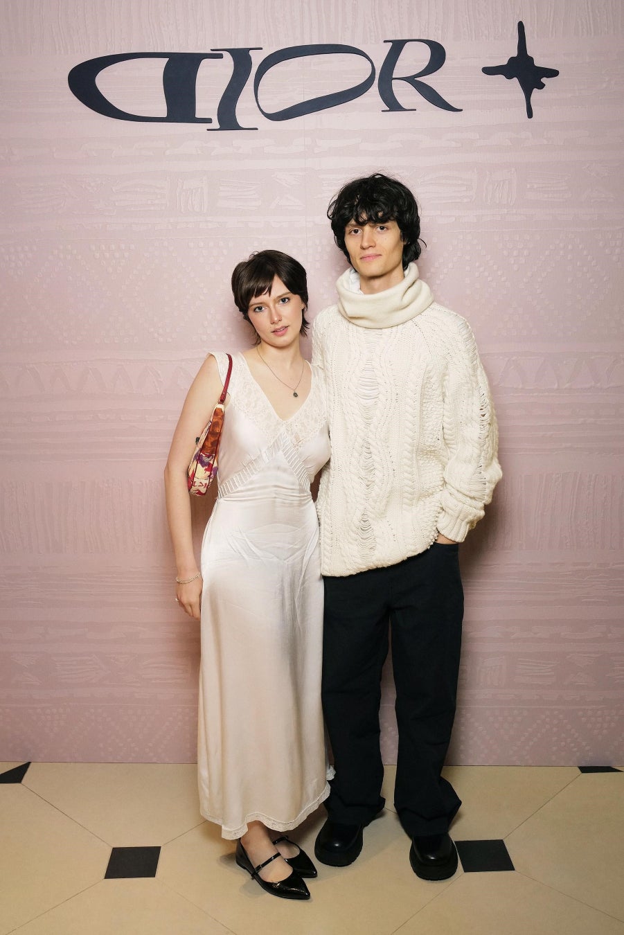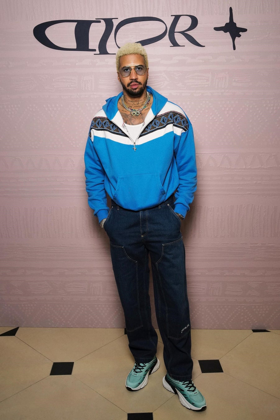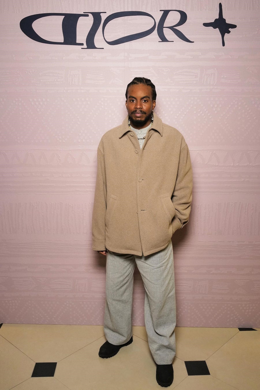 アーサー・コンティは、オフホワイトのウール&カシミアケーブルステッチモックネックニットとレザータグ付きブルーデニムパンツに、ブラックの「ディオール カルロ」ダービーシューズを合わせ登場しました。