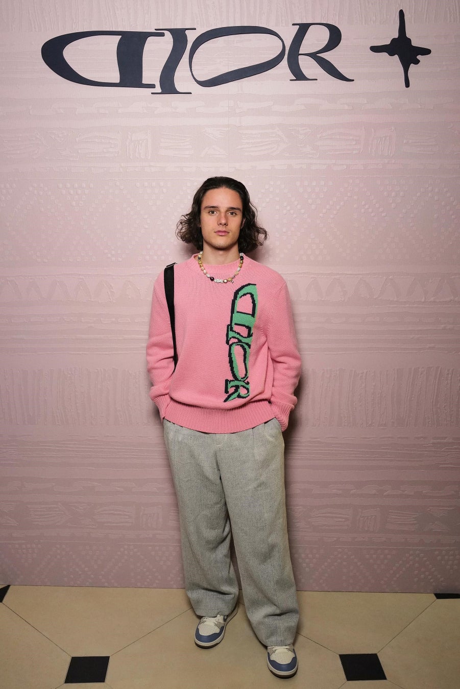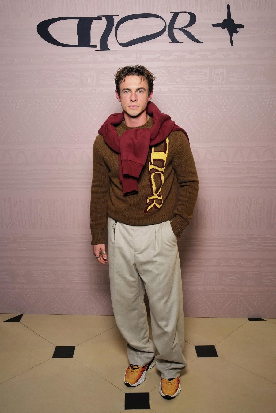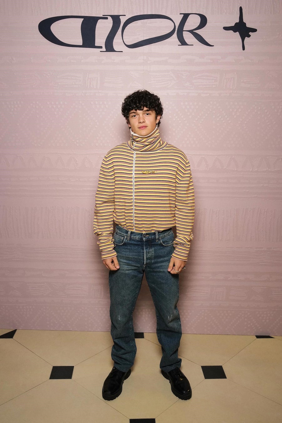 ノア・ジュープは、刺繍とサムホールが施されたストライプのウールジップカーディガンと、ブラックの「ディオール カルロ」ダービーシューズを着用し登場しました。