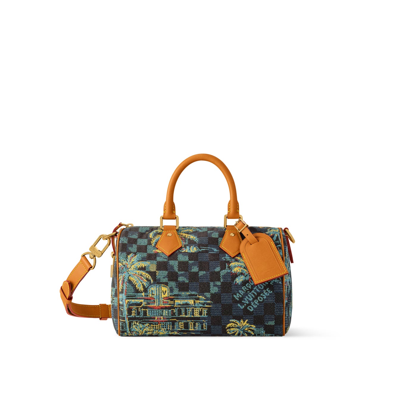 織りの技法で描いたデザインが特徴的な「スピーディ·バンドリエール 25」。パームツリーとアール·デコ調の建物が、同シリーズならではのエンブレマティックなラインにビーチの雰囲気をプラス。ゴールドカラーの金具とレザートリミングがデザインを完成させます。さまざまな持ち方を楽しめる、トップハンドルと取外し & 調節可能なストラップ付き。