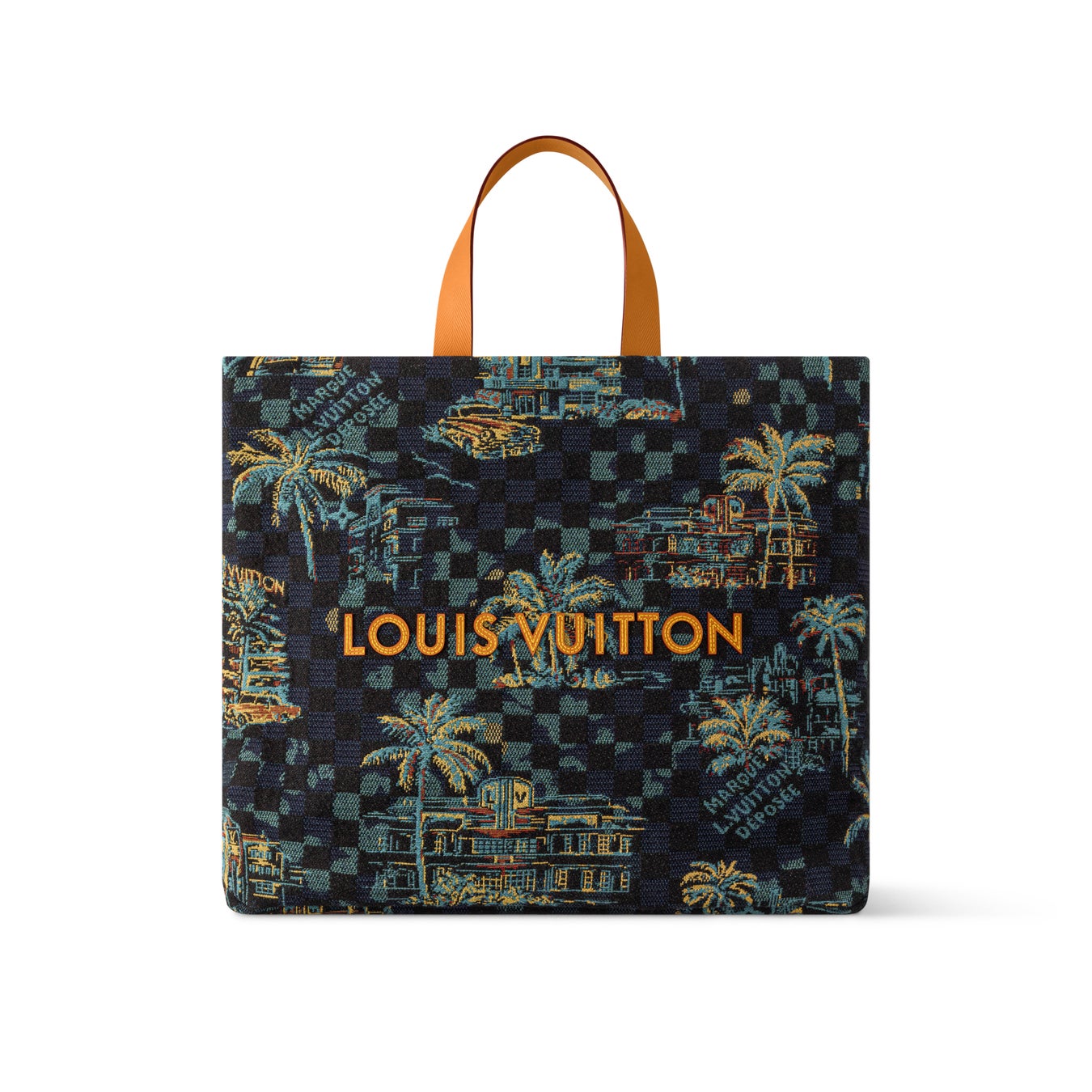 マリーナブルーの背景にパームツリーや象徴的な建物、クラシックカーなどのマイアミのシンボルが描かれた「ショッパー·トート MM」。ファレル·ウィリアムスが手掛けたアイコニックな「Marque L. Vuitton Déposée」シグネチャーを贅沢な装飾にさりげなく取入れました。
