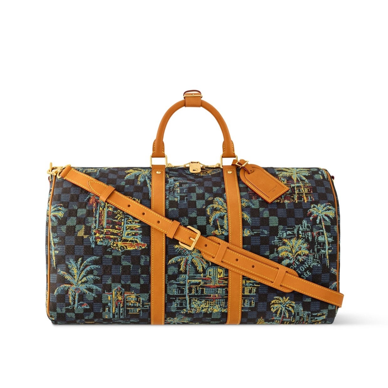 「キーポル·バンドリエール 50」は、さりげないチェック·パターンを背景に、パームツリーやアイコニックな建築物、クラシックカーがメゾンのクラフツマンシップが際立つ織りの技法で表現されています。メゾンを象徴する「Marque L. Vuitton Déposée」シグネチャーが、華やかな装飾の中にひっそりと配されたデザイン。