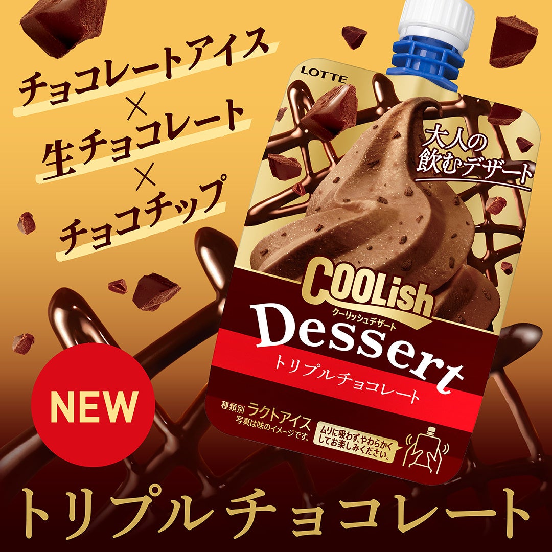 株式会社ロッテは、11月8日(火) に“飲むアイス” 「クーリッシュ」ブランドから、大人の飲むデザート『クーリッシュデザート トリプルチョコレート』を発売します。2021年11月、2022年3月に発売した「クーリッシュデザート」第3弾となる今回は、チョコレートアイスに生チョコレートとチョコチップを合わせたチョコづくしの味わいです。頑張った一日のご褒美に、デザート感覚で楽しめる「夜専用!?」の進化系クーリッシュをお楽しみください。