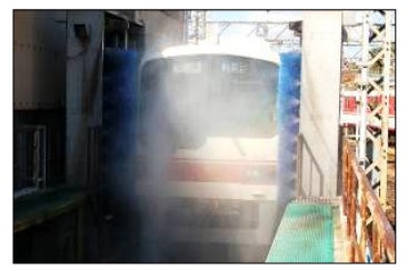電車に乗ったままで、洗車機の中を通り抜けます。